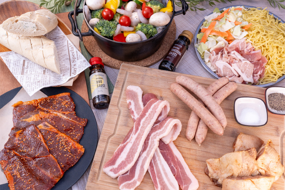 3種のお肉にフランクフルト・焼きそばの定番アイテムに加えて、アヒージョとガーリックバケットがセットになった、種類豊富な食材を楽しめる食材セット。