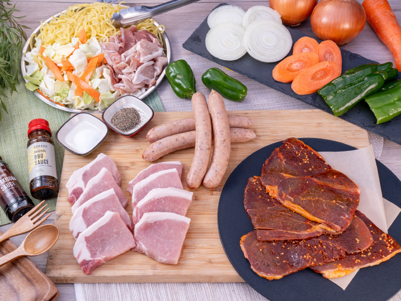 4種のお肉とフランクフルト、焼き野菜、焼きそばがついた、ボリューム満点な食材セット。
