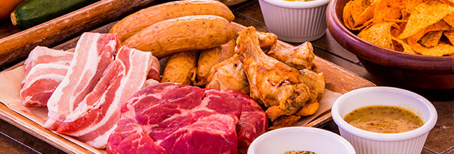 ビーフとポーク、フランクフルトに加え、焼き野菜、オリジナル焼きそばがセットになった、BBQの定番セット