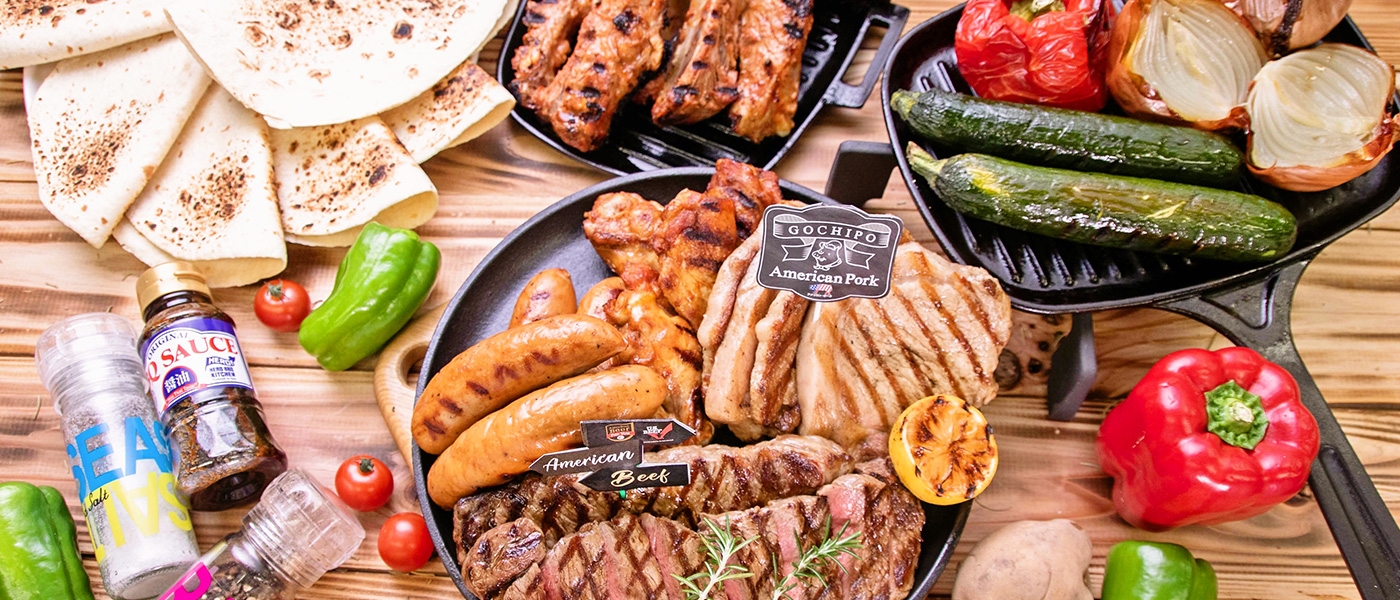ビーフとポーク、フランクフルトに加え、焼き野菜、オリジナル焼きそばがセットになった、BBQの定番セット