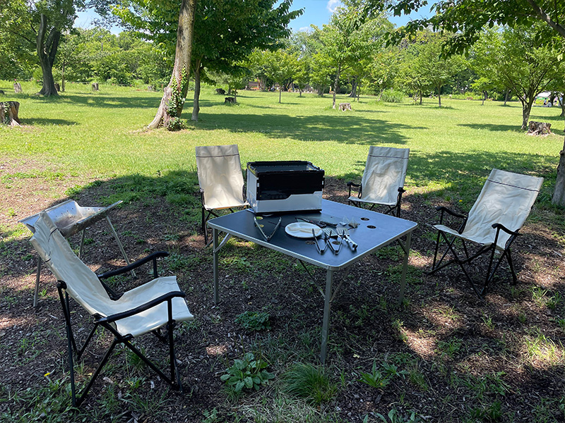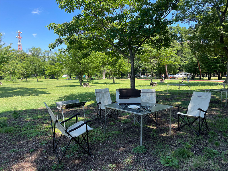 ※バーベキュー用炭グリル(炭3kg・網・炭ばさみ付き)・鉄板・折り畳みテーブル・イス・フライ返しセット・トング・紙皿(1名につき2枚)・割ばし・おしぼり・ゴミ袋(1グループにつき4枚)・着火ライター・アルミプレート)